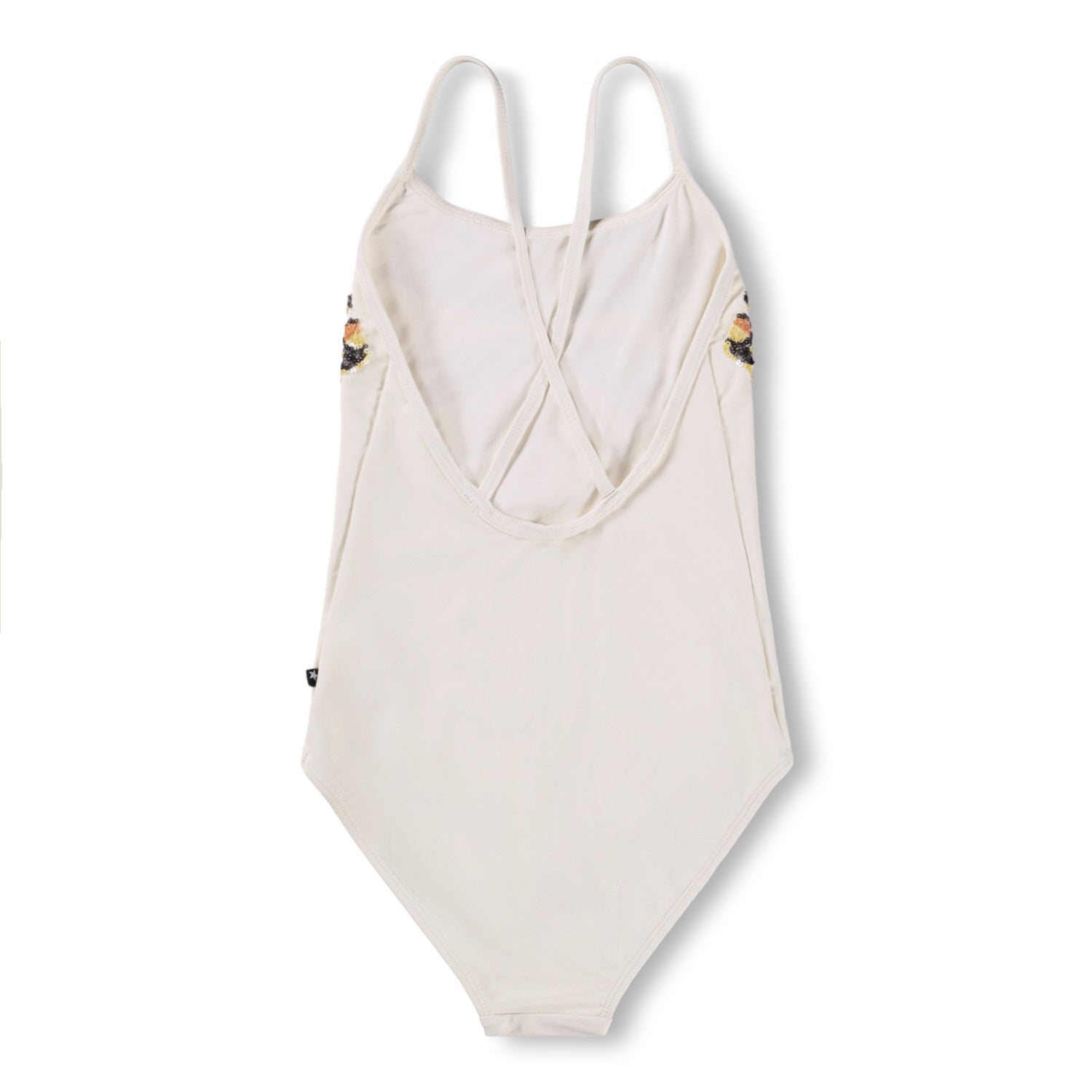 The Nanna Glitter Wings Swimsuit by Molo is a sweet suit for a sunny vacation. 80% Polyester recycled from post-consumer waste/ 20% Elastane