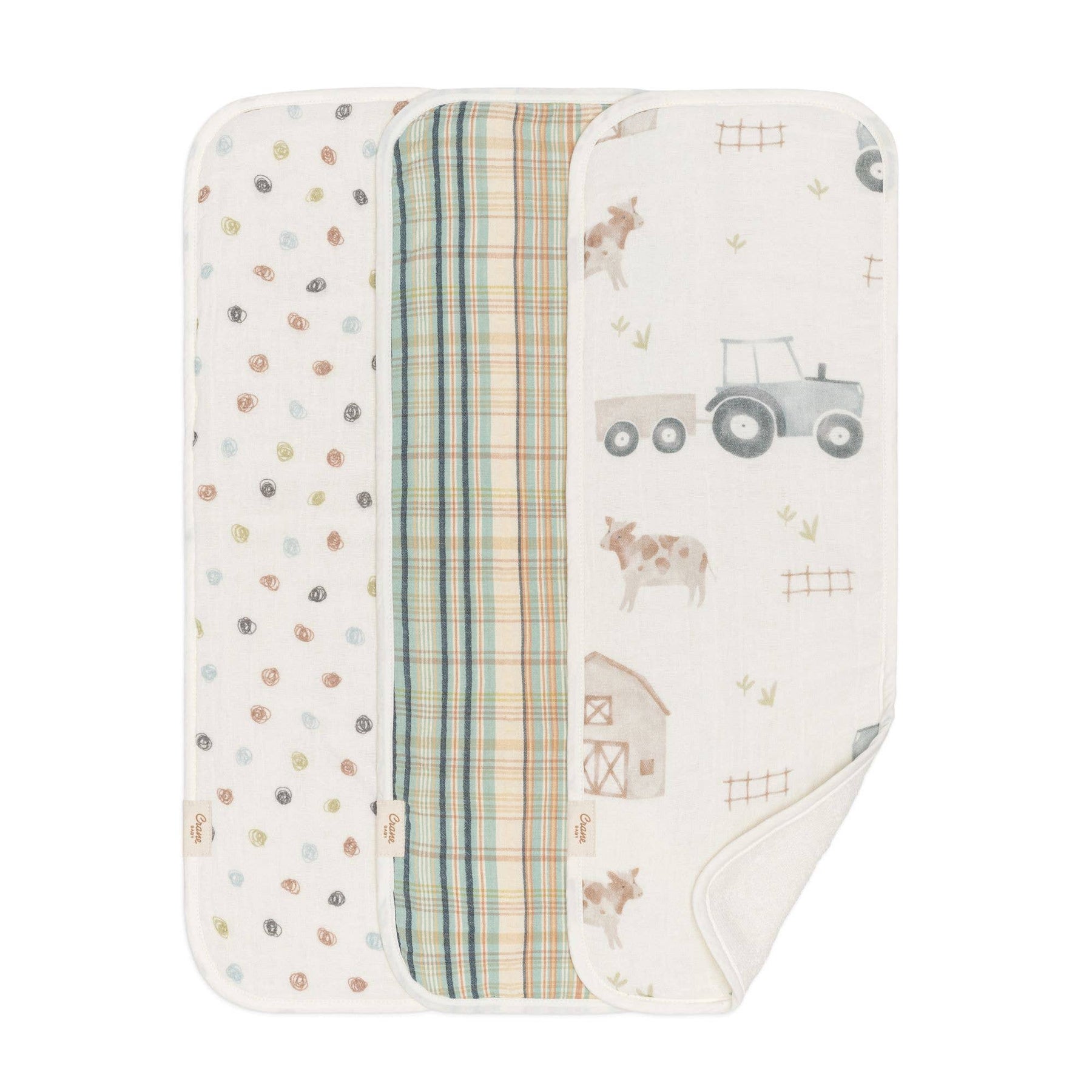 Catch every little mess with the Charlie 3-pc. Farmhouse Tractor Burp Cloth Set. Made from ultra-soft, absorbent cotton muslin and terry cloth, each burp cloth features whimsical tractor prints and coordinating plaid and polka dots. Generously sized to keep you and baby covered, these burp cloths get softer with every wash. A practical essential with a nostalgic twist, they’re perfect for feeding, burping, or keeping in your diaper bag.