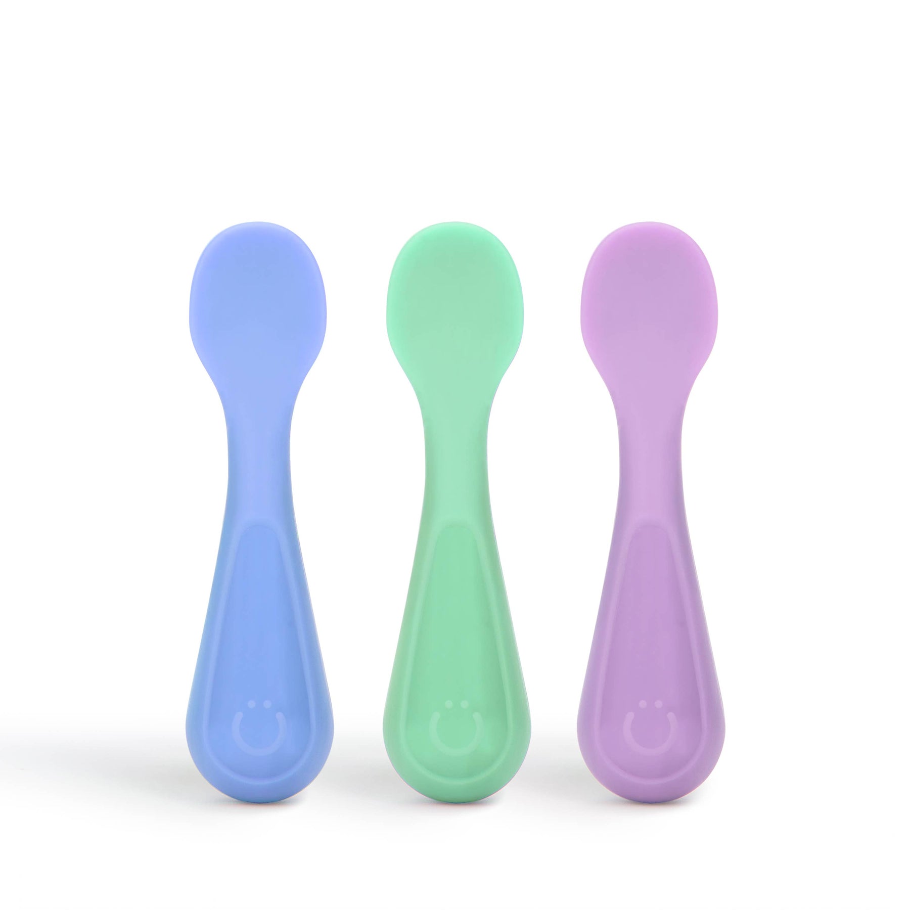 The Silicone Utensils for Toddlers - 3 Pack are training spoons help babies 6 months and up learn how to self-feed safely and comfortably. The flexible silicone design is gentle on gums and ideal for beginners. · The baby spoons are made from 100% premium food-grade silicone.