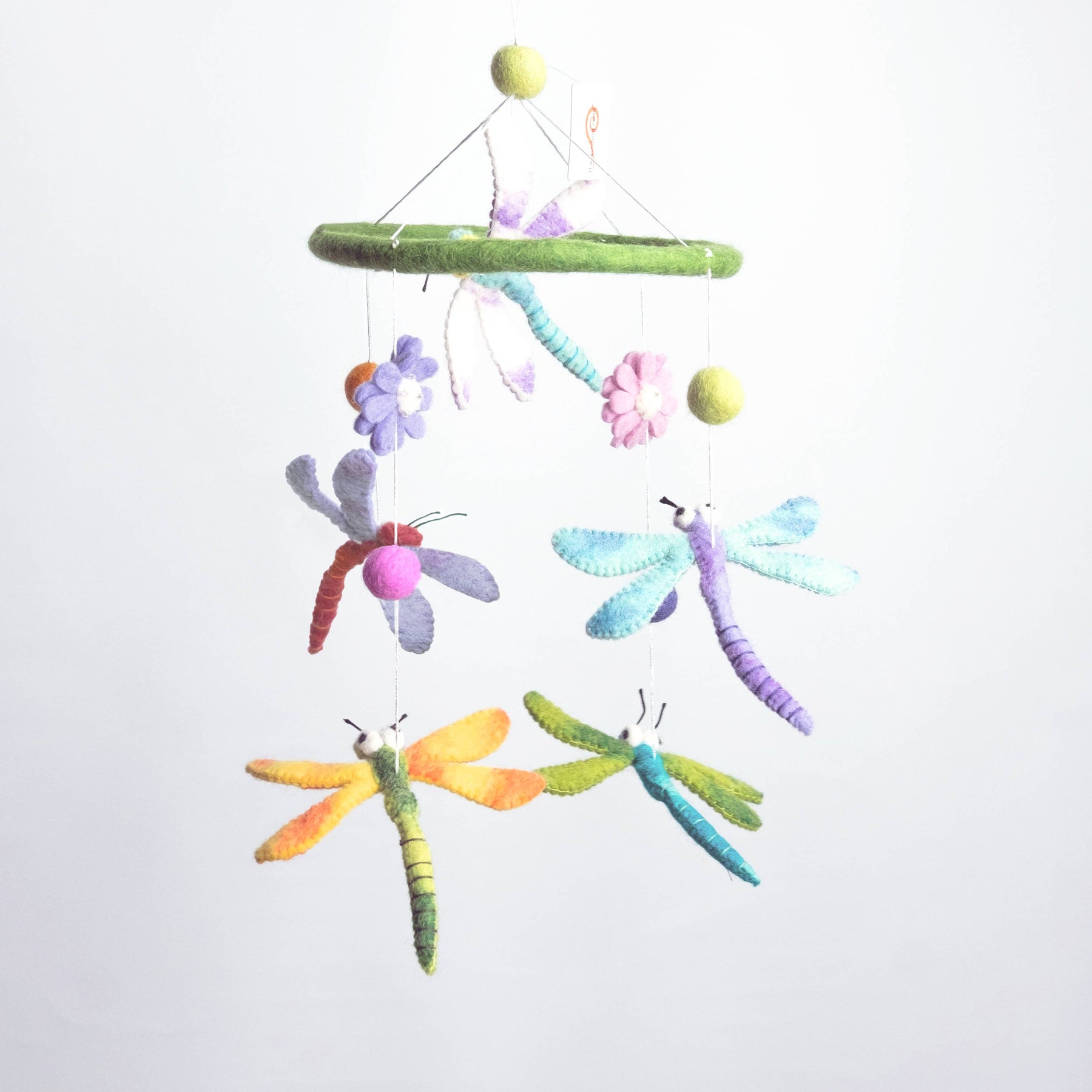 The Dragonfly - Baby Mobile by The Winding Road are handmade in Nepal in our family-owned workshop that follows fair trade practices. Free from any chemicals and crafted from 100% natural wool, each mobile features felted figures that gently rotate from a felt hoop and hang over the crib.