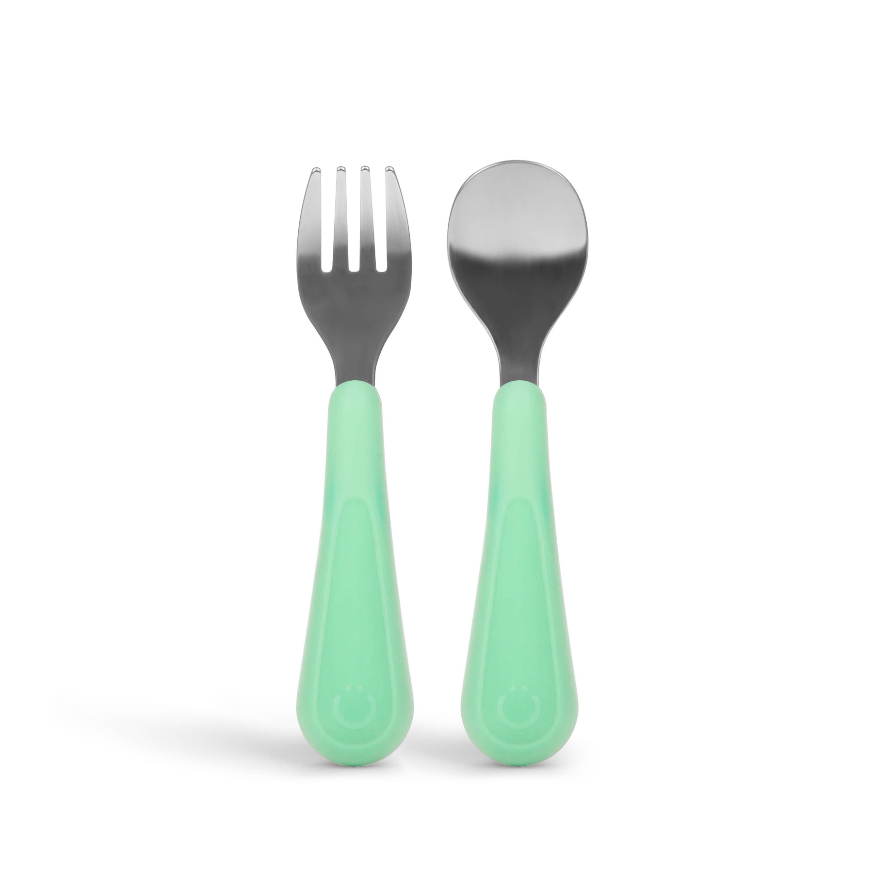 The Stainless Steel Utensils - Green includes 1 toddler fork and 1 toddler spoon designed for toddlers learning to self-feed with fun colors to attract your toddlers' interest.