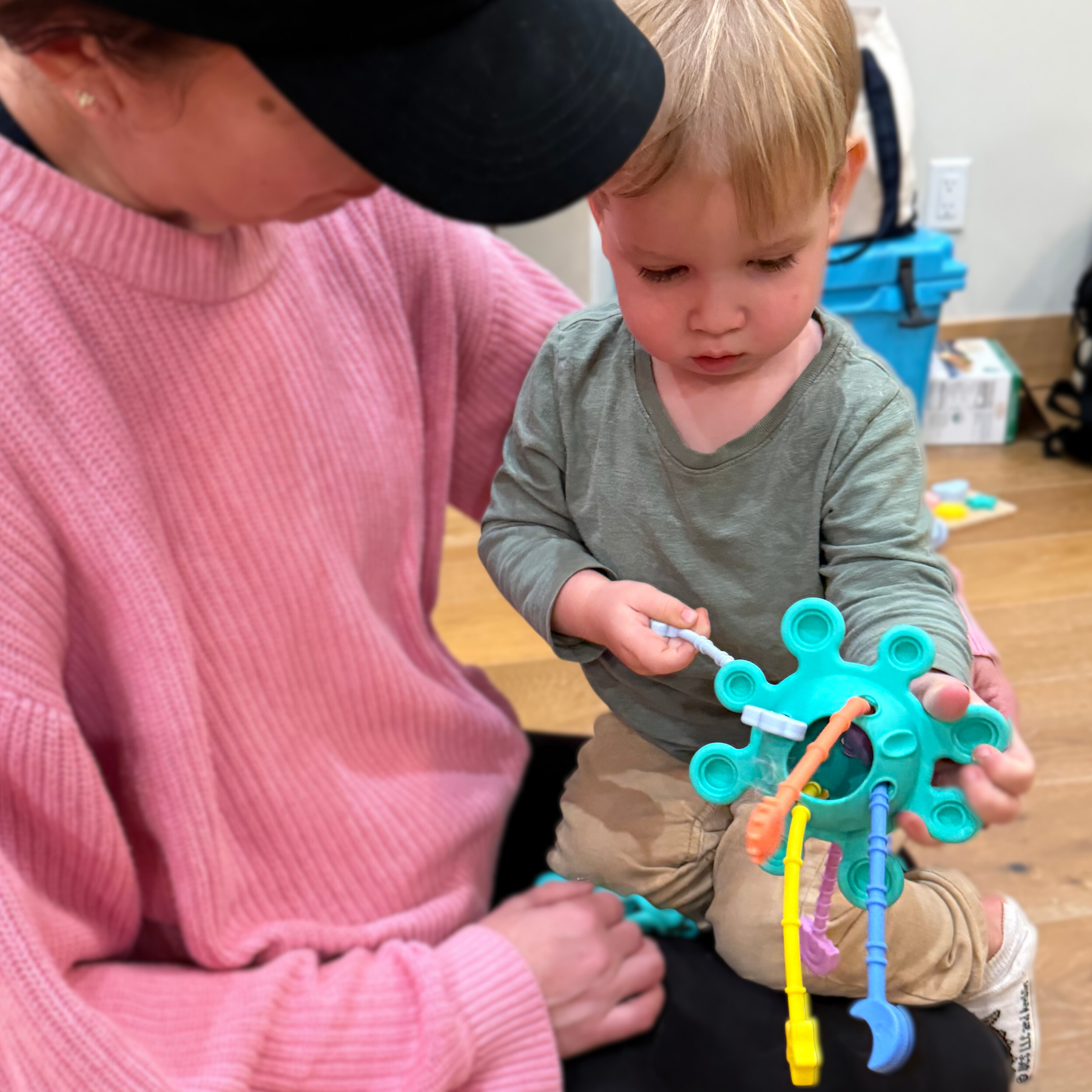 - Flexible arms and textured elements invite sensory exploration