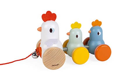 Pull-Along Hens and Chicks by Jarod are ideal for encouraging movement in young children! Featuring a bell that moves as the toy is pulled, make way for the hen family coming through! All three hens are attached by springs, so there's no chance of losing anyone along the way!