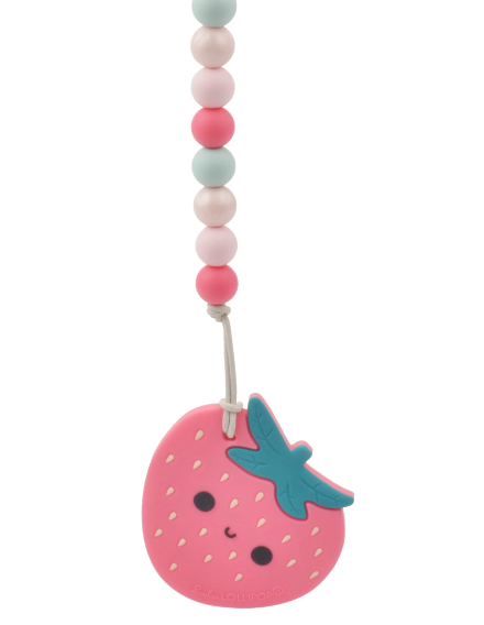 The Strawberry Teether by Loulou Lollipop is a silicone teether with clip set comes with a standalone silicone teether and a pacifier/teether holder for the ultimate teething relief.