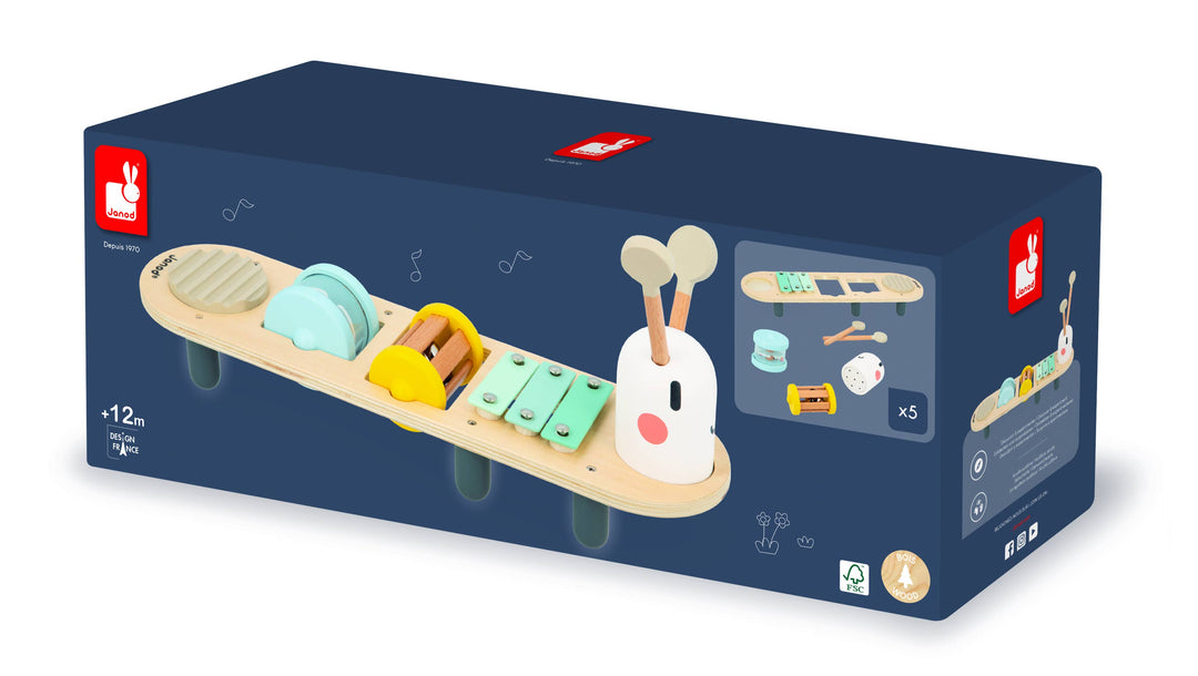 Make some noise with the Caterpillar Music Stand by Janod! This musical stand has 5 built-in sound activities. The head is a maracas that doubles as storage for the sticks. There's a maracas to add rhythm, a xylophone to play melodies, a bell for a sweet sound, a rain stick to imitate the soothing sound of rain, and a scratcher for a unique sound texture. This musical stand is ideal for helping your child discover and experiment with different sounds!