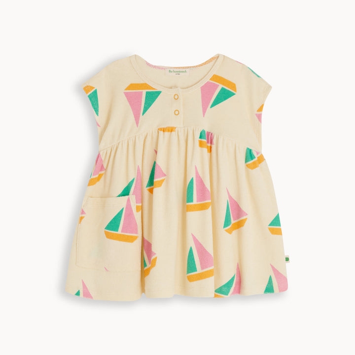 Short sleeve all over print baby & kids dress with a front pocket. Made from 100% certified organic cotton terry towelling, for softness, and comfort.