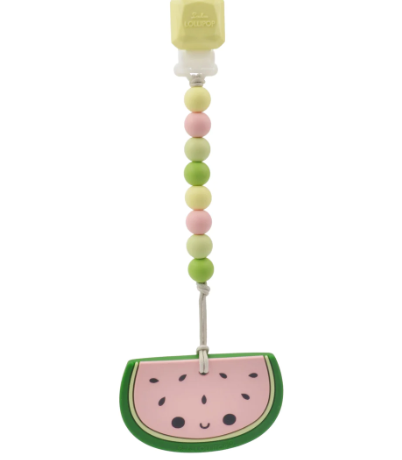 The Watermelon Teether by Loulou Lollipop is a silicone teether with clip set comes with a standalone silicone teether and a pacifier/teether holder for the ultimate teething relief.